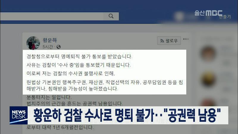 내년 총선 출마를 밝힌 황운하 전 울산지방경찰청장이 경찰청에서 명예퇴직 불가 통보를 받았습니다. 황 청장은 오늘(12/1) 자신의 페이스북에 검찰이 수사 중이라는 이유로 자신의 명예퇴직 불가를 통보해 헌법상 기본권을 침해받을 가능성이 커졌다며 "공권력 남용"이라고 말했습니다. 황 청장은 "김기현 전 시장 형과 동...