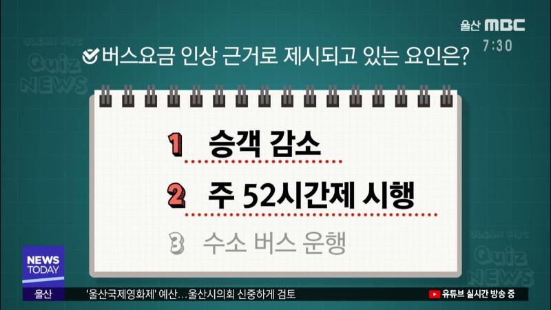 현재 울산지역 일반 시내버스의 성인 현금 요금은? 1 1> 1천300원 2> 1천250원 ------------ 이달 말 인상이 예정된 일반 시내버스의 성인 현금 요금은? 1 1> 1천500원 2> 1천450원 -------------- 버스요금 인상 근거로 제시되고 있는 요인은? 1 2 1> 승객 감소 2> 주 52시간제 시행 3> 수소 버스 운행 ---------------- ...