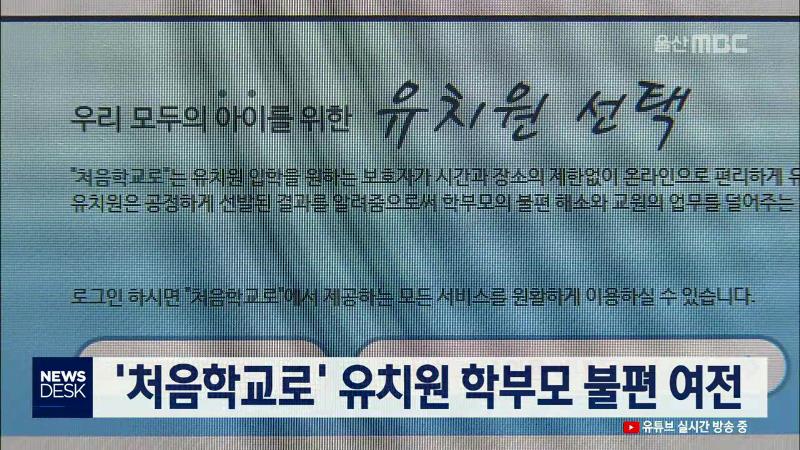 유치원 입학지원 시스템인 '처음학교로'가 도입 취지와 달리 여전히 학부모들의 불편을 덜지 못하고 있습니다. 학부모들은 지원한 유치원에 예비 합격한 경우 추가 합격 여부에 대한 통보가 별도로 없어 등록 시기를 놓칠 우려가 많다며 시스템 개선을 요구하고 있습니다. 또 3순위까지 유치원에 모두 탈락한 경우 추가 모...