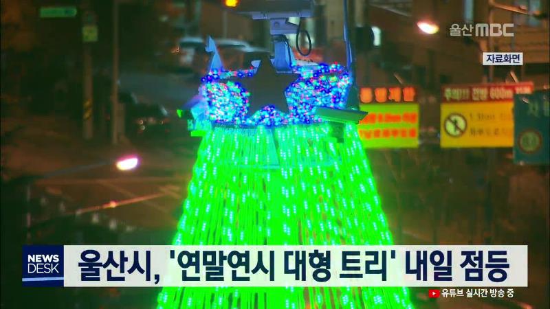 울산시가 올해를 보내고 2020년 경자년 새해를 맞이하는 '연말연시 염원 트리'를 내일(12/1)부터 남구 태화로터리에 설치합니다. 높이 20m, 지름 10m 규모의 대형 트리는 내년 2월 2일까지 매일 오후 5시 30분부터 7시간 동안 점등되며, 다양한 형태의 전등으로 시민들에게 희망 메시지를 전달할 것이라고 울산시는 설명했...