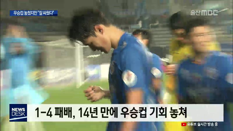 ◀ANC▶ 프로축구 울산현대가 포항스틸러스에 쓰라린 패배를 당하면서 우승 문턱에서 좌절했습니다. 2005년 우승 이후 14년 만에 우승이 물거품이 됐는데요. 그래도 팬들은 올 한해 선수들이 최선을 다해 잘 싸워졌다며 뜨거운 격려를 보냈습니다. 유영재 기자 ◀END▶ ◀VCR▶ ◀SYN▶ 경기 종료 휘슬 경기 종료를 알...