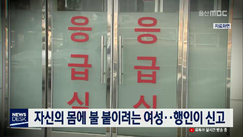 오늘(11/28) 오후 2시 10분쯤 남구 신정동의 한 건물 앞을 지나가던 행인이 자신의 몸에 불을 붙이려는 여성을 발견하고 경찰에 신고했습니다. 해당 여성은 경미한 부상을 입고 인근 병원으로 이송됐습니다. 경찰은 여성이 자신의 몸에 발화성 물질을 뿌린 후 불을 붙이려고 했지만 불이 제대로 붙진 않은 것으로 보인다며 ...