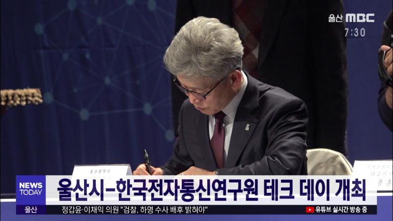 '울산시-한국전자통신연구원 테크 데이'가 오늘(11/27) 롯데호텔에서 개최됐습니다. 이 행사에서 울산시와 한국전자통신연구원은 공동연구개발 협력사업의 기술 성과를 발표하고, 중소기업을 대상으로 한 기술 이전 방안을 논의했습니다. 이어 울산시와 한국전자통신연구원, 한화종합화학 등 3개 기관은 업무 협력 협정서를...