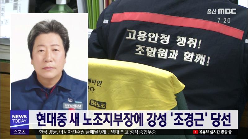 어제(11/27) 실시된 현대중공업 노조지부장 선거에서 강성 노선의 현 집행부 사무국장 조경근 후보가 당선됐습니다. 조경근 당선자는 투표자 9천475명 중 54.3%의 득표률로 실리·중도 성향의 유상구 후보를 따돌렸습니다. 조 당선자는 조합원 임금과 복지 확대, 통상임금 빠른 승소, 정년 연장 제도적 준비, 현대중공업 그...