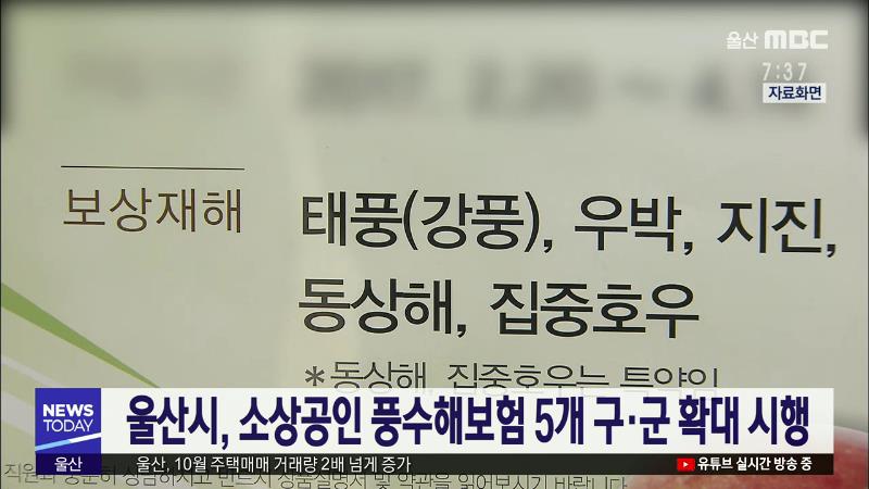 울산시는 어제부터(11\/25) 소상공인 풍수해보험 지원 사업을 5개 구·군으로 전면 확대 시행합니다. 풍수해보험 지원 사업은 울산시와 행정안전부가 보험료 절반 이상을 보조해 태풍과 홍수, 대설, 지진 등 예상하지 못한 자연 재난에 시민이 대처할 수 있도록 돕는 제도입니다. 울산시는 중구와 울주군이 시범 실시했고, ...