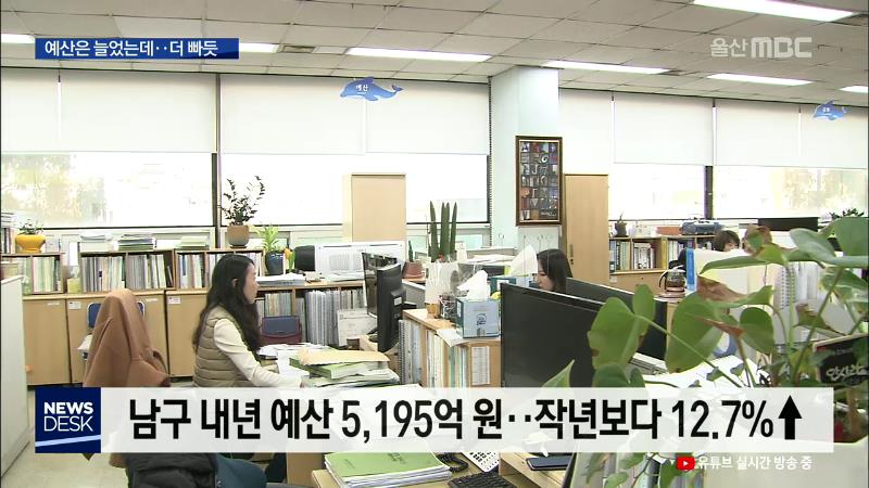 ◀ANC▶ 울주군을 제외한 울산지역 각 구청의 내년 살림살이 규모가 일제히 올해보다 늘었습니다. 그런데, 되려 자유롭게 쓸 수 있는 자체 예산은 줄었다는데요, 왜 그런지 이돈욱 기자가 분석해 봤습니다. ◀END▶ ◀VCR▶ 울산의 대표적인 부자 동네인 남구가 발표한 내년 예산 규모는 5천195억 원. 지난해에 비해 12....