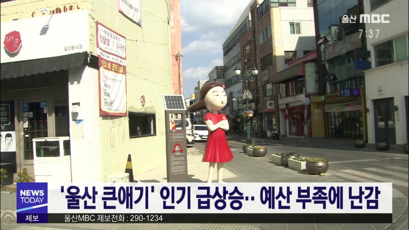중구의 대표 캐릭터인 울산 큰애기의 인기가 급상승하면서 조형물을 설치해달라는 민원도 급증하고 있습니다. 중구 지역에 24개의 울산 큰애기 조형물을 설치한 중구청은 최근 추가 설치를 요청하는 민원이 10건 이상 접수됐지만, 예산 부족으로 사업비 확보가 어렵다며 예산 확보 방안을 다양하게 고려하고 있다고 밝혔습...
