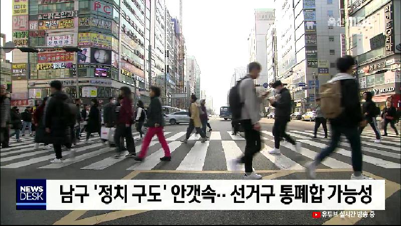 ◀ANC▶ 내년 총선이 4개월여 앞으로 다가온 가운데 남구지역 선거 구도가 요동치고 있습니다. 선거구 통폐합 대상으로 꼽히는 데다, 구청장과 기초의원 재선거까지 동시에 치러질 수 있다는 전망까지 나오고 있습니다. 최지호 기자. ◀END▶ ◀VCR▶ 남구의 정치 시계가 한 치 앞도 내다보기 힘든 상황으로 빠져들고 있...