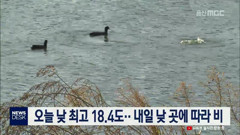 주말인 오늘(11\/23) 울산지방은 구름 많은 날씨 속에 낮 최고 기온이 18.4도까지 오르며 온화한 가을 날씨를 보였습니다. 일요일인 내일은 대체로 흐리겠고 11도에서 20도의 다소 높은 기온 분포가 예상되며 낮 동안 한차례 비가 내리겠습니다. 울산기상대는 내일까지 평년을 웃도는 기온 분포를 보이다가 다음 주부터 찬 ...