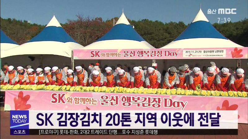 SK 울산콤플렉스는 오늘(11\/21) 울산대공원 남문광장에서 김장행사를 열고 10kg들이 김치 2천 상자를 마련해 지역 소외계층 1천100세대와 사회복지시설 80곳에 전달했습니다. 임직원들과 자원봉사자들이 함께 마련하는 SK의 김장 행사는 16년째 이어지고 있으며, 그동안 2만 5천여 세대의 이웃들과 김장김치를 나눠왔습니...