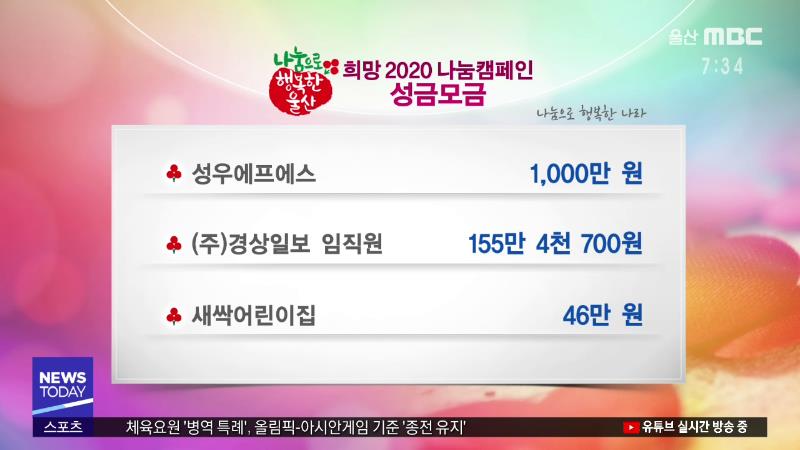 다음은 '희망 2020 나눔캠페인'에 참여해주신 분입니다. ------------------------------------------- 성우에프에스 1,000만 원 (주)경상일보 임직원 155만 4천 700원 새싹어린이집 46만 원 -------------------------------------------을 기탁하셨습니다. ------------------------------------------- 성금은 한 통화 3...
