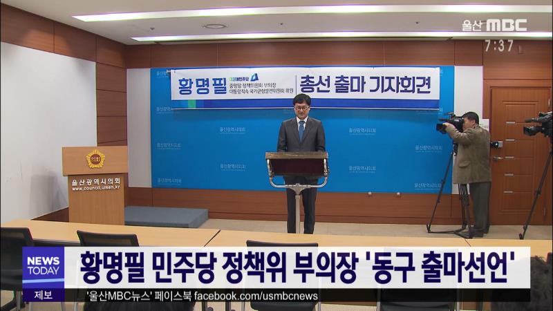황명필 더불어 민주당 중앙당 정책위원회 부의장은 오늘(11\/20) 기자회견을 열고 내년 총선에 동구지역 출마를 선언했습니다. 황 부의장은 대통령직속 국가균형발전위원회 국민소통 특별위원으로 활동하고 있는 경험을 살려, 고향인 울산에서 동구민들과 소통하며 민의를 대변해 나가겠다고 밝혔습니다.\/\/