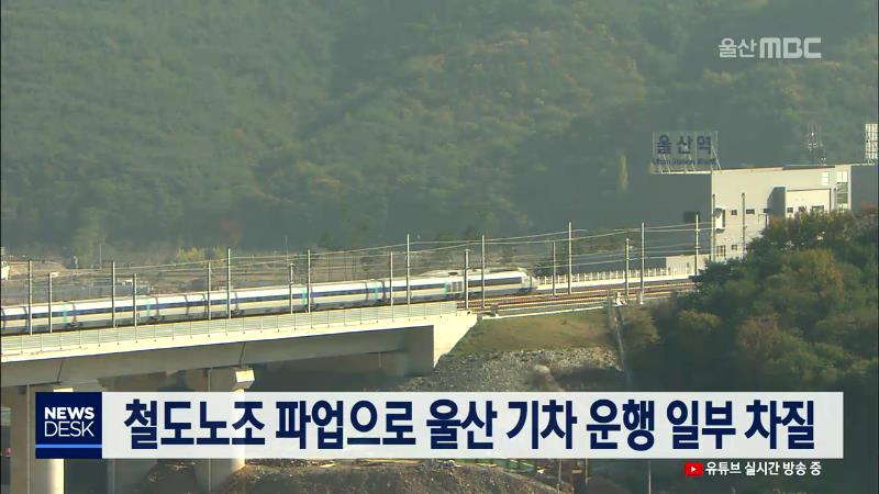 전국철도노조의 파업으로 울산역과 태화강역의 열차 운행에도 일부 차질이 빚어지고 있습니다. 오늘(11\/21) 울산역을 오가는 고속열차 108편 중 KTX열차 14편이 운행을 하지 않았으며, 태화강역에서도 기차 64편 중 14편이 운행을 하지 않습니다. 철도노조는 인건비 정상화와 4조 2교대 근무형태 변경을 위한 안전인력 충...