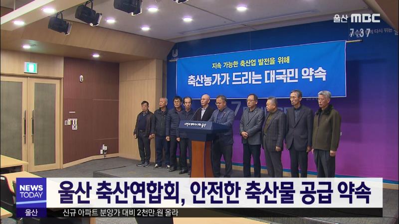 울산시 축산단체연합회는 오늘(11\/19) 시청에서 기자회견을 열고 아프리카돼지열병을 비롯한 가축 관련 질병 발생이 우려되는 가운데 신뢰받는 축산업이 될 수 있도록 먼저 변하겠다고 약속했습니다. 이들은 동물의약품의 안전 사용기준을 철저히 준수하고, 내 농장은 내가 지킨다는 각오로 질병 방역과 축사 청소에 최선...