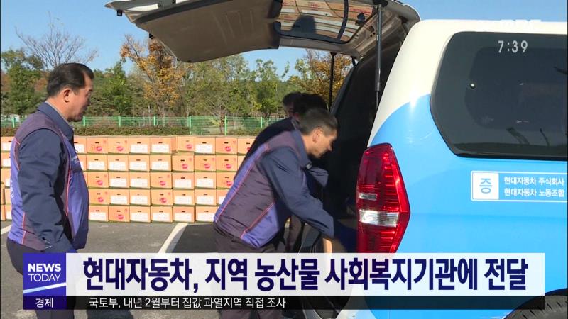 현대자동차 노사가 배와 사과, 쌀 등 지역 농산물을 대량으로 구매해 159개 사회복지기관에 전달했습니다. 현대차는 오늘(11\/19) 지역 농산물 나눔 행사를 열고 울주군 지역 12개 자매결연마을에서 구입한 6천만 원 상당의 농산물을 사회복지공동모금회를 통해 전달했습니다. 올해 15억 6천만 원 상당의 지역 농산물을 구...