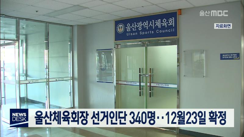내년 1월 7일 치러지는 울산체육회장 선거에 투표권을 가지는 선거인단 규모가 340명으로 확정됐습니다. 울산시체육회는 오늘(11\/19) 열린 선거관리위원회 2차 회의에서 이같이 결정하고 선거인단 340명의 명단은 다음달 23일 추첨 등을 통해 확정하기로 했습니다. 또 이후 입후보자 추첨을 통해 기호를 정하기로 했으며, ...