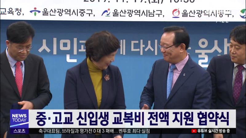 울산시와 5개 구·군, 울산시교육청은 오늘(11\/19) 시청에서 '울산시 중·고등학교 신입생 교복비 지원 협약'을 체결했습니다. 이들 기관은 내년 중·고교 신입생 2만2천368명에게 여름과 겨울 교복비 실비에 해당하는 25만 원을 지원합니다. 전체 사업비는 55억9천만 원으로, 교육청이 60%, 울산시가 30%, 구·군이 10%씩 부...