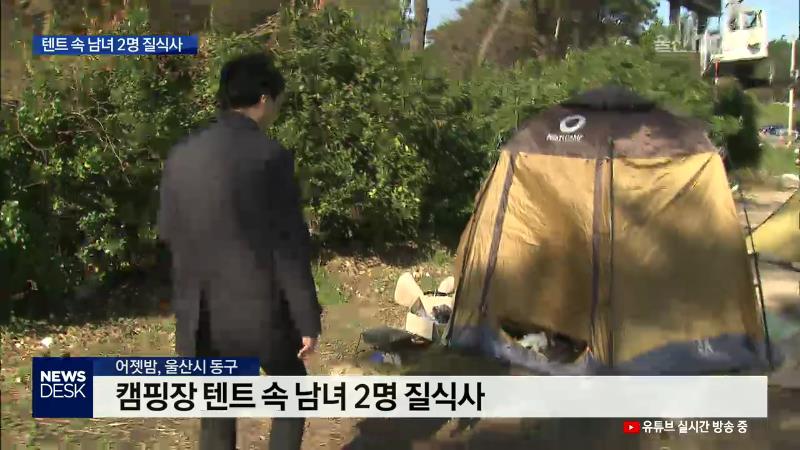◀ANC▶ 어젯밤(지난 18일 밤) 동구 바닷가의 한 캠핑장 텐트 안에서 40대 남녀가 숨진 채 발견됐습니다. 경찰은 두 사람이 일산화탄소 중독으로 숨진 것으로 보고 있습니다. 겨울철마다 반복되는 캠핑 질식 사고, 각별한 주의가 필요합니다. 이용주 기자. ◀END▶ ◀VCR▶ 울산시 동구의 한 캠핑장. 어젯밤(지난 18일 ...