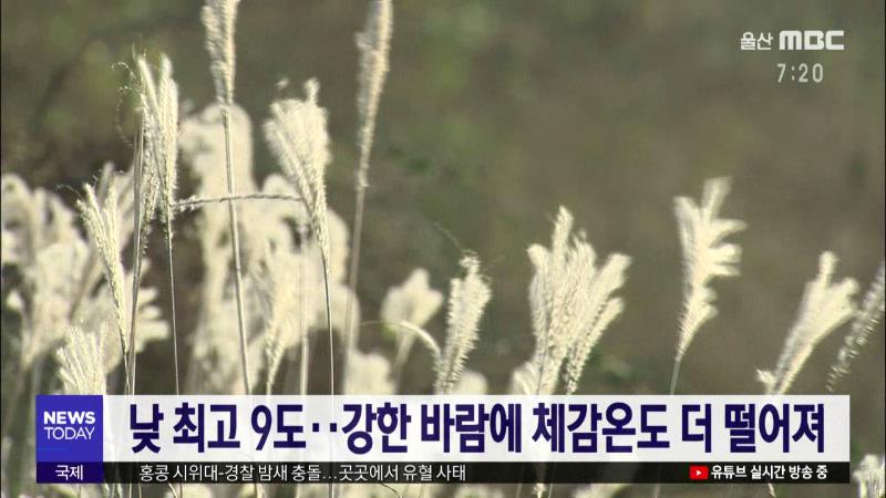 오늘(11\/19) 울산지방은 고기압 가장자리에 들며 구름 많겠고 아침 최저 기온 5도로 시작해 한낮의 기온도 9도에 머물며 매서운 추위가 찾아오겠습니다. 내일은 맑겠고 아침 최저 1도에서 낮 최고 11도의 기온 분포로 일교차가 큰 날씨가 예상됩니다, 울산기상대는 오늘 낮은 기온과 함께 강한 바람도 함께 불며 체감 온도...