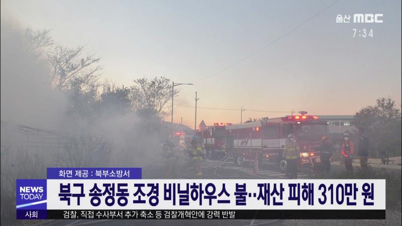 어제(11\/14) 오후 5시 10분쯤 북구 송정동 조경수 재배 관리동 비닐하우스에서 화재가 발생해 내부 집기 등을 태워 소방서 추산 310만원 상당의 재산 피해를 낸 뒤 출동한 소방대에 의해 13분 만에 진화됐습니다. 소방당국은 펑 소리와 함께 검은 연기가 발생했다는 목격자 등의 진술을 토대로 정확한 화재 원인을 조사하...