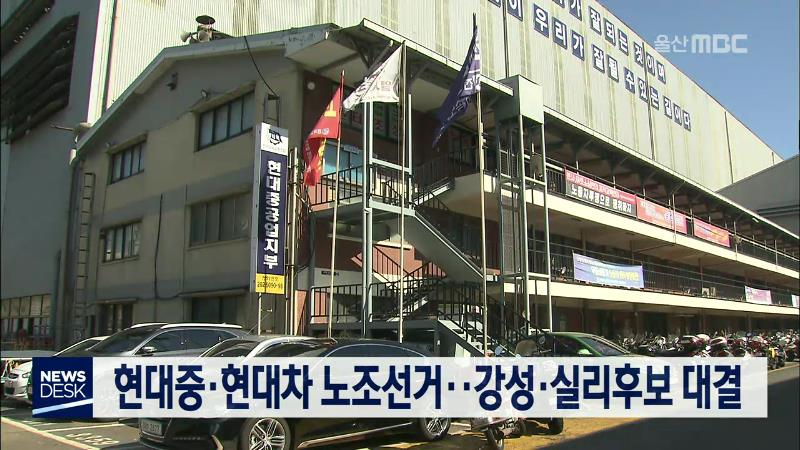 울산의 양대 노조가 차기 위원장 선거에 돌입했습니다. 오는 28일 1차 투표를 진행되는 현대차 노조 위원장 선거에는 4명이 입후보했으며 이 가운데 3명은 강성, 1명은 중도 실리 성향으로 분류되고 있습니다. 현대중공업 노조도 오는 27일 차기 위원장 선거를 벌이기로 하고, 내일(11\/15)부터 입후보자 등록을 받는데 현...