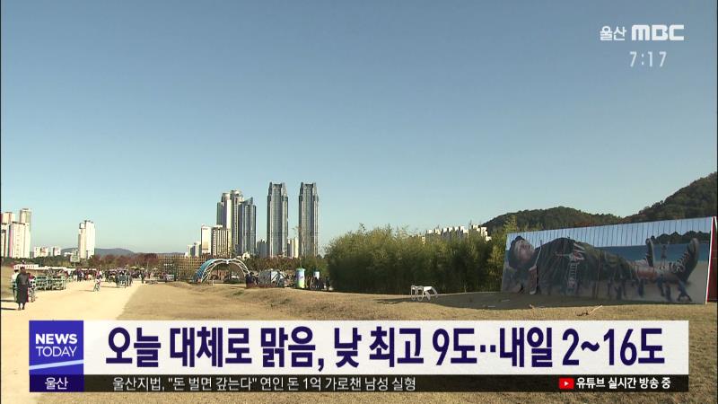 수능일인 오늘(11\/14) 울산은 고기압의 영향을 받아 대체로 맑겠습니다. 오늘 아침 최저 기온은 5도로 평년과 비슷했으나 낮 최고 기온은 9도로 예상돼 어제보다 8도 정도 떨어지면서 쌀쌀하겠습니다. 내일도 대체로 맑겠으나, 아침 최저 기온이 올 가을들어 가장 낮은 2도까지 떨어진 뒤 낮 최고 기온은 16도로 평년 기온...