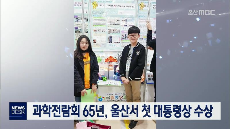 과학전람회 65년만에 울산에서 첫 대통령상과 국무총리상이 동시에 탄생했습니다. 울산과학관은 제65회 전국과학박람회에서 학성고 2학년 김성윤, 이경하, 이창운 학생이 '중화반응 예측 프로그램 개발 및 산업현장 활용방안'으로 대통령상을 수상했다고 밝혔습니다. 또 무거초등학교 6학년 전문수, 박세현 학생은 '3차원 ...