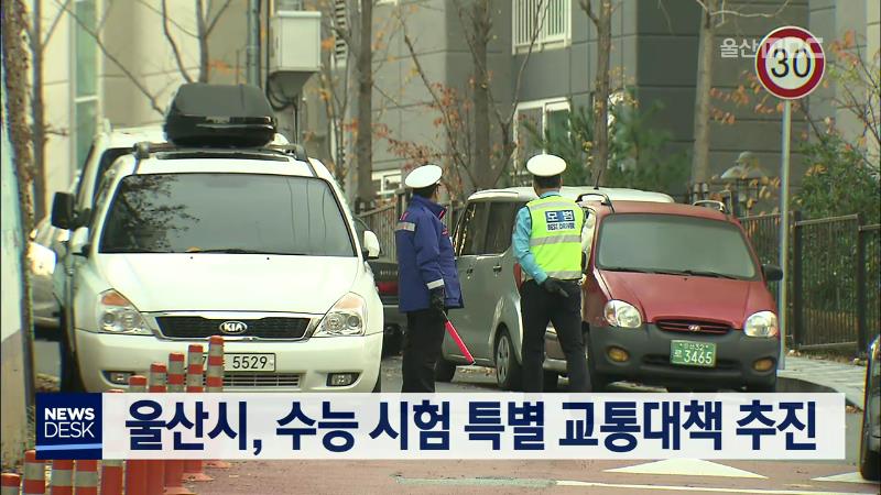 울산시가 수능일인 모레(11\/14) 수험생의 편의를 위해 특별 교통 대책을 추진합니다. 시는 수험생 등교 시간대에 시내버스 배차를 늘리고, 관공서와 50인 이상 사업체의 출근 시간을 오전 10시로 조정하기로 했습니다. 또 택시부제와 승용차 요일제를 일시 해제하고 26개 시험장 주변 200미터 내 차량 통행과 주차를 통제...