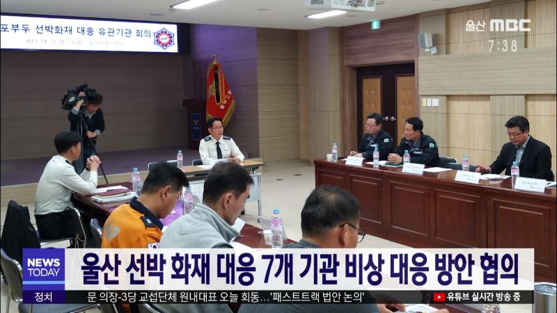 지난 9월28일 발생한 울산 염포부두 선박 화재와 관련해 7개 관계기관 20여명이 참석해 비상 대응 방안을 협의했습니다. 동부소방서에서 열린 오늘(11\/11) 회의에서는 기관별 비상상황 단계별 역할 분담, 선박 화재 대응 방안 모색, 긴급구조 통제단 운영 방안, 유관기관 핫라인 구축 등에 대해 심도있는 의견을 나눴습니...