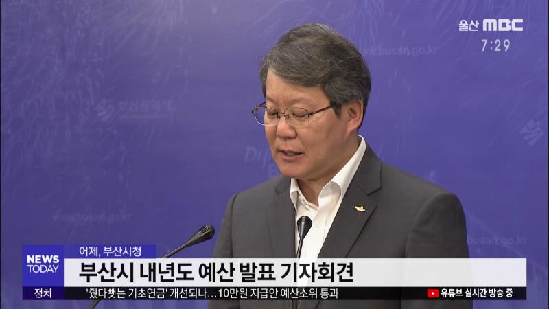 ◀ANC▶ 부산시도 내년도 예산을 편성했는데요, 역대 최대 규모인 12조 5천억원을 편성 해 시의회로 넘겼습니다. 울산보다 사회복지 예산이 더 많아 전체 예산의 41%를 차지했습니다. 지역 경제와 관련된 산업과 과학기술 예산은, 사회복지 예산의 1\/10 수준입니다. 부산 이만흥 기잡니다. ◀VCR▶ 부산시가 내년도 예산...
