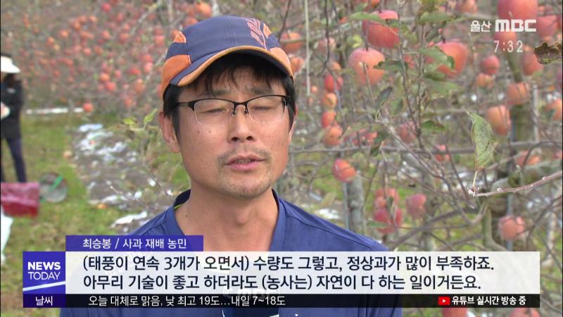 ◀ANC▶ 어제는 흔히 빼빼로 데이로 많이 알고 계실텐데, '농업인의 날'이기도 합니다 그렇지만 올해는 가을에만 태풍이 3개나 몰려와 농가 피해가 컸던데다, 최근 정부가 WTO 개발도상국 지위마저 포기하면서 농민들의 마음이 무겁습니다. 경남 서창우 기자가 농민들을 만나봤습니다. ◀END▶ ◀VCR▶ 본격적인 수확철...