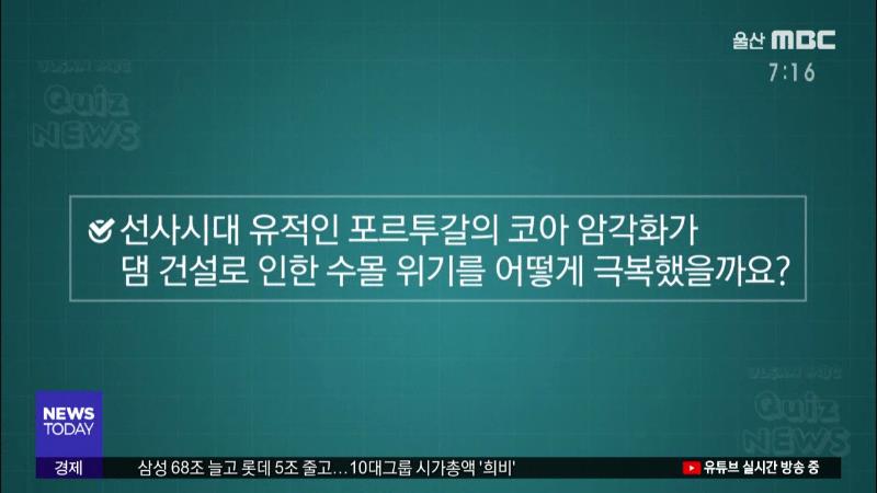 선사시대 유적인 포르투갈의 코아 암각화가 댐 건설로 인한 수몰 위기를 어떻게 극복했을까요? 1 1>댐 건설 중단 2>암각화 이전 --------------------------- 포르투갈 코아댐 건설 중단을 주도한 사람은? 1 1>코아 중등학교 학생 2>포르투갈 시민단체 ---------------------------- 반구대암각화의 주요 훼손 원인은? 1 1>...