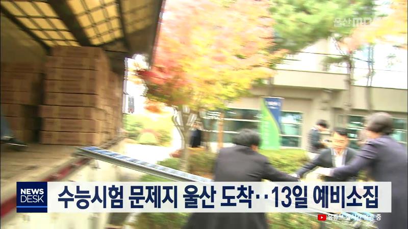 오는 14일 열리는 2020학년도 대학수학능력시험을 앞두고 오늘(11\/11) 오후 수능시험 문제지가 울산에 도착했습니다. 또 오는 13일에는 수험생 예비소집이 열리며 수험생 본인이 응시원서 접수증과 신분증을 지참하고 참석해야 수험표를 받을 수 있습니다. 울산에서는 이번 수능시험에 1만 1천 773명이 응시할 예정입니다....