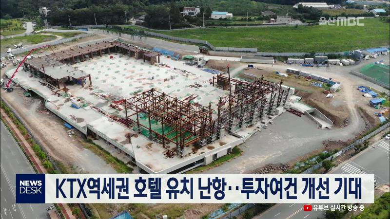 울산시의 역점 사업인 3천억 원 규모의 KTX역세권 호텔 유치가 3년째 난항을 거듭하고 있습니다. 울산도시공사는 전시컨벤션센터와 복합환승센터 등과 연계한 역세권 개발 효과를 극대화하기 위해 삼남면 일원 1만 ㎡ 부지에 호텔 개발사업자 선정 공모를 진행하고 있지만, 투자자가 없어 사업이 답보상태라고 밝혔습니다. ...