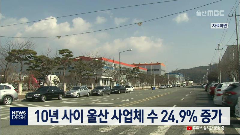 2017년 기준 울산의 사업체 수는 8만3천872개로 10년 사이 24.9% 증가해 전국 평균 23.2%보다 증가율이 높았던 것으로 나타났습니다. 동남지방통계청이 발표한 10년간 울산 산업구조 변화를 보면, 사업체 수는 전국보다 증가율이 높았던 반면 종사자 수는 52만1천482명으로 28.2% 증가하는 데 그쳐 전국 평균 증가율 35.6%...