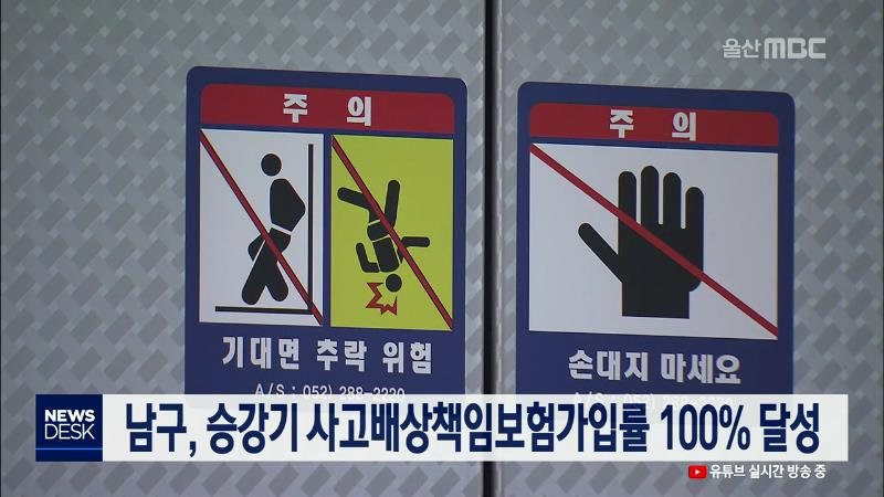 남구가 2개월 만에 승강기 사고배상책임보험 가입률 100%를 달성했습니다. 남구는 지역 내 전체 승강기 5천533대 가운데 철거나 폐업 중이라 가입대상이 아닌 15대를 제외한 전체가 책임보험에 가입해 지난 8월 기준 1.23%였던 가입률이 10월 말 기준 100%를 달성했다고 밝혔습니다. 한편 승강기 책임보험을 가입하지 않으...
