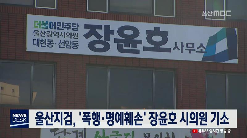 울산지검은 남구의 한 주민자치위원장을 폭행하고 상대방의 명예를 훼손한 혐의로 장윤호 시의원을 불구속 기소했습니다. 장 의원은 지난해 12월 송년회 뒷풀이 자리인 남구의 한 노래방에서 술에 취해 주민자치위원장을 폭행하고 명예를 훼손한 혐의 등으로 7개월여 동안 경찰 조사를 받았습니다. 한편 검찰은 장 의원이 ...