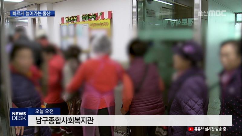 ◀ANC▶ 울산지역의 노인인구 비중이 매년 크게 늘어나는 것으로 나타났습니다. 특히 독거노인 가구와 기초생활수급자의 성장세가 뚜렷한데 실업률은 늘어나고 있어 특단의 대책이 시급한 실정입니다. 이용주 기자. ◀END▶ ◀VCR▶ 점심 시간, 복지관 1층 복도에 긴 줄이 늘어섰습니다. 모두 배식 순서를 기다리는 60살...