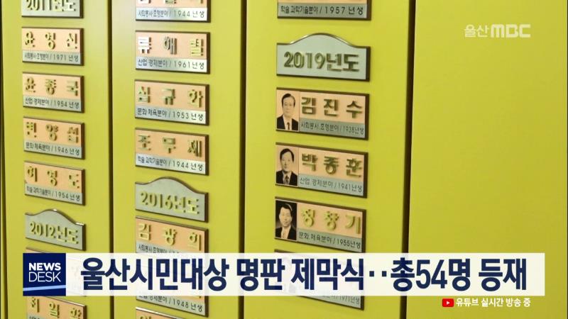 제18회 울산시민대상을 받은 수상자 4명에 대한 명판 제막식이 오늘(11\/4) 울산박물관 2층 명예의 전당에서 개최됐습니다. 오늘(11\/4) 등재된 수상자는 사회봉사 효행 부문에 김진수씨 산업경제 부분에 박종훈씨 문화체육부분에 정창기씨, 학술 과학기술부분에 김진영 씨등입니다. 울산시민대상 명예의 전당은 지난 2014...