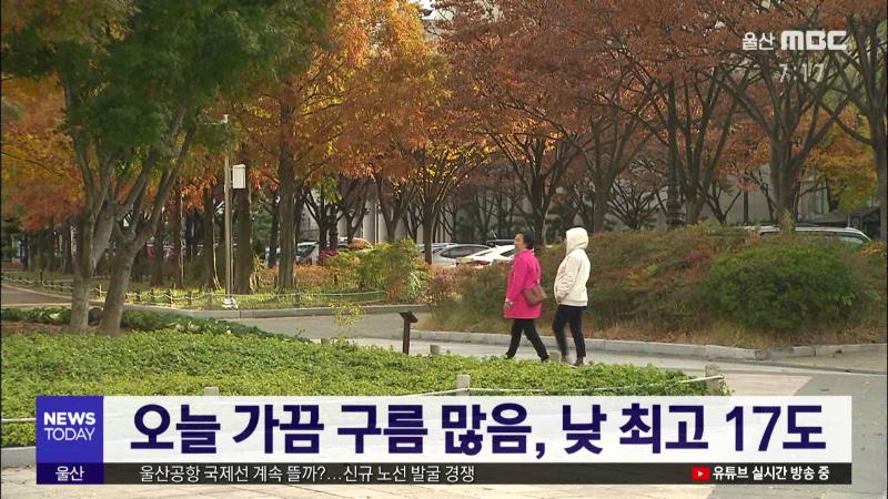 1) 현재 울산지역은 구름이 가끔 끼어있습니다. 낮부터는 맑은 하늘이 드러나겠는데요, 현재 울산의 기온 14도를 나타내고 있고, 오늘 한낮 기온은 17도에서 그치겠습니다. 오늘 활동하시기 무난한 가을 날씨가 예상됩니다. 2) 요즘 중국에서 유입되는 황사가 기승인데요, 오늘 울산지방은 원활한 대기 확산으로 공기질 청...