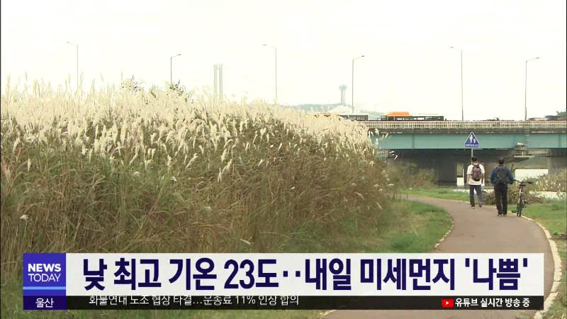 오늘(11\/1) 울산지방은 고기압의 영향으로 맑겠으며 아침 최저 기온 10도로 시작해 한낮에는 23도까지 올라 일교차 크겠습니다. 주말인 내일은 미세먼지 농도가 나쁨 수준을 보이며 대기질 좋지 않겠고 아침 최저 12도에서 낮 최고 21도의 기온 분포를 보이겠습니다. 울산기상대는 일요일인 모레 오후부터 울산 해안지역을...